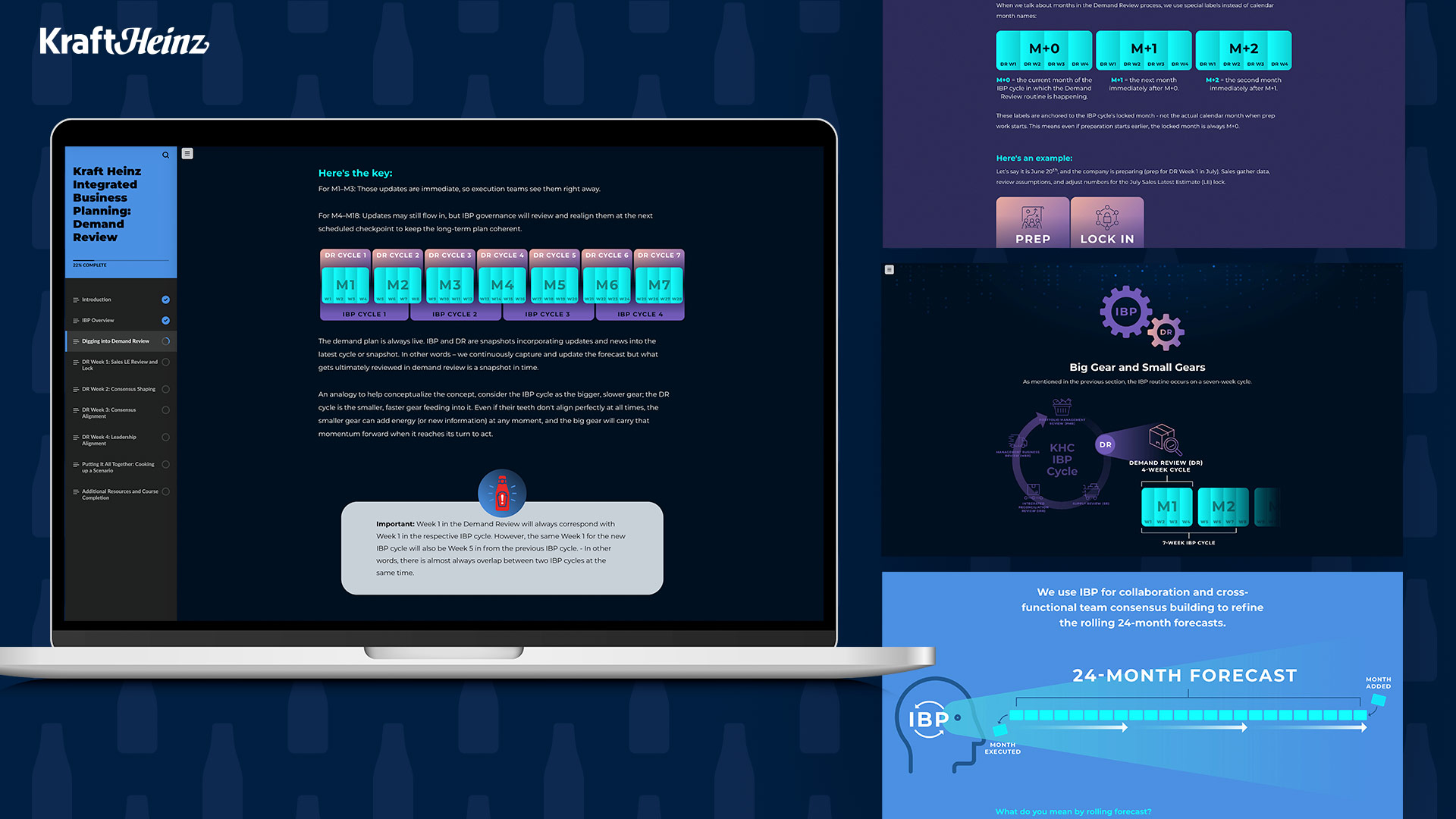 Partnering with Kraft Heinz, a 30-minute Rise eLearning course was built to help employees across all zones understand the Demand Review Process and how it fits into the bigger Integrated Business Planning picture. The course combines custom illustrations, branded visuals, and knowledge checks to make a company-wide rollout feel polished and engaging.